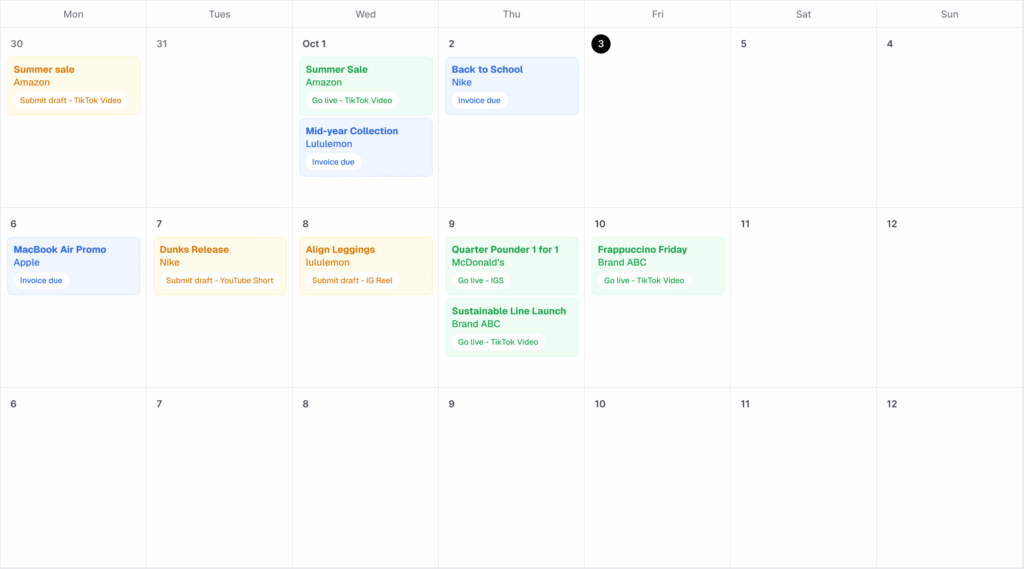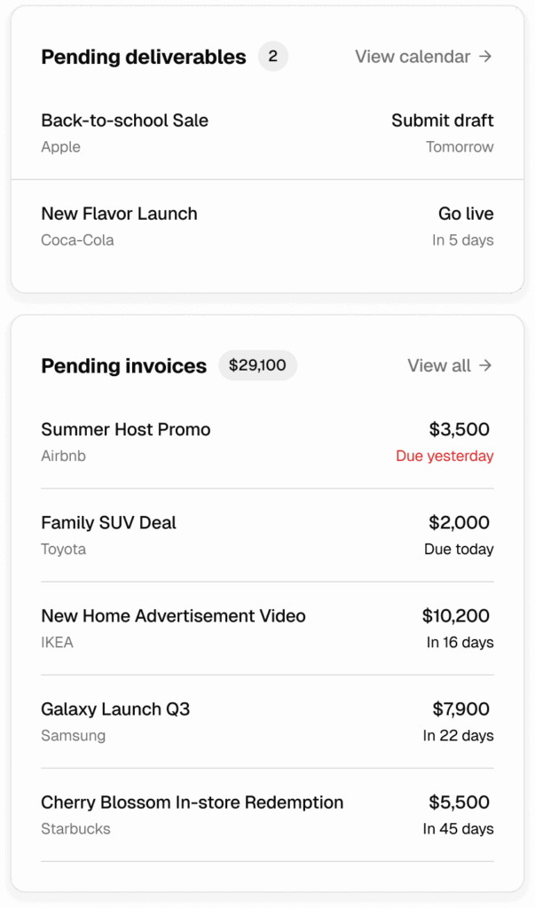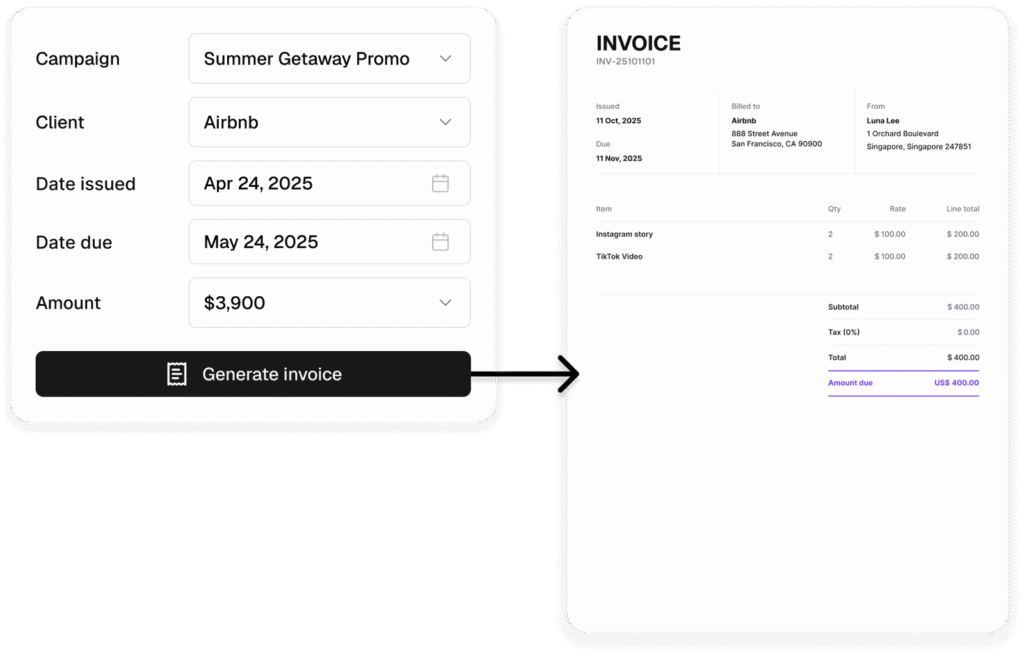 Invoices are what content creators send to clients to collect payment for the campaign. Not all campaigns require an invoice as they may involve non-monetary forms of compensation such as free products/services and credits.