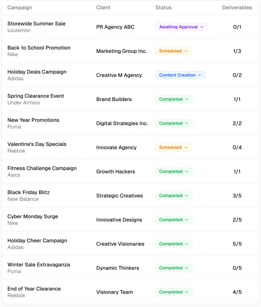 Track campaigns. Monitor timelines & deliverables.