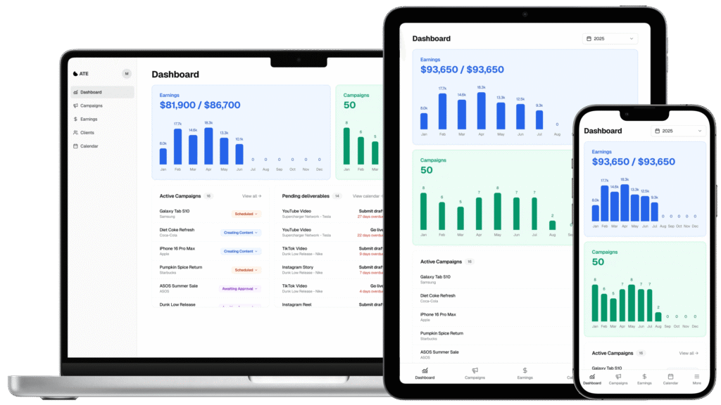 ATE is a platform made for content creators to help them track their campaigns (aka brand deals) and create invoices. It’s built to be super simple, so no complicated business & accounting terms. We want content creators to focus on creating, not admin work.